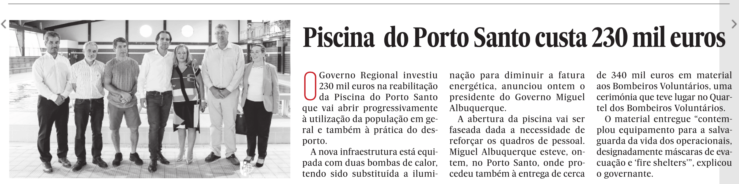 "O Governo Regional fez um investimento de 230 mil euros na reabilitação desta infraestrutura exatamente para ser utilizada pela população do Porto Santo, na área da formação, na área do desporto - natação -, e também para a hidroginástica", sublinhou o Presidente do Governo Regional, Miguel Albuquerque, na visita à infraestrutura que se encontrava encerrada ao público desde novembro de 2011.A reconversão energética permitirá no imediato reduzir custos na fatura energética, sendo que a infraestrutura irá ainda beneficiar ainda da conclusão de uma obra em curso, conforme explicou o governante: "aquando da conclusão da escola vão ser utilizados parte dos painéis solares que vão ser instalados para fornecer energia solar também aqui, à piscina".